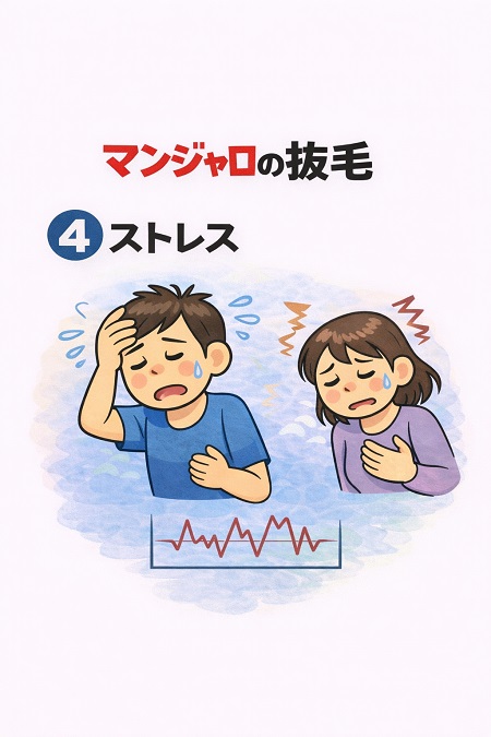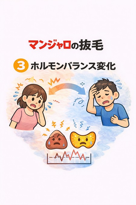 マンジャロ副作用の抜け毛はホルモンバランスの乱れが原因で起こります。 ホルモンバランスが乱れる原因は、急激な体重減少や体脂肪率の低下により視床下部にストレスを与え、女性ホルモン分泌(エストロゲン)が乱れたり、マンジャロの食欲抑制効果で摂取カロリーが減少し、栄養不足になることでホルモンバランスを崩す要因となります。 女性ホルモンのエストロゲンは髪の毛の成長を促進し、毛周期を正常に保つ働きがありますので エストロゲンが減少すると毛周期が短くなり、髪の成長が抑制され、抜け毛が増えます。 また、マンジャロの副作用で多い吐き気や、食欲低下がストレスとなってコルチゾール(ストレスホルモン)の分泌が増加し、抜け毛が増えることがあります。