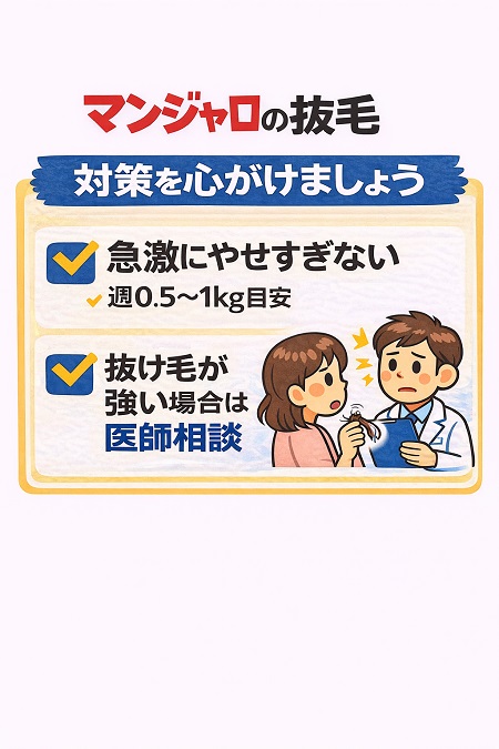 マンジャロ副作用の抜け毛(禿げる)は急激な体重減少や体脂肪率の低下、ホルモンバランスの乱れによる「休止期脱毛症」ですので、 抜け毛対策としては急激なダイエットやストレスをかけない事が重要です。吐き気や、食欲低下が続く場合は早めに医療機関へ相談してください。