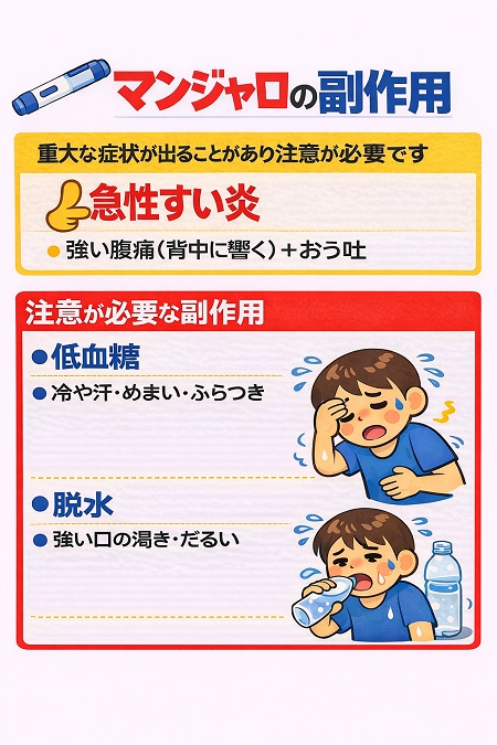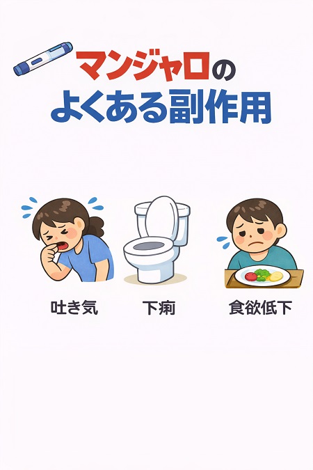 マンジャロの主な副作用は、初回投与から1〜2週目に消化器症状の副作用である吐き気、嘔吐、下痢、便秘、腹痛、消化不良、食欲減退、食欲不振などがでやすく、4〜6週間以内に自然軽快する傾向があります。また、低血糖や膵炎、胆嚢炎、アナフィラキシーなどの重篤な副作用も報告されていますので、症状(副作用)が気になる場合は、我慢せず注射を中止して医師に相談してください。