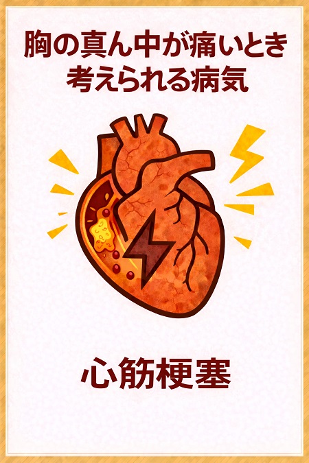 心筋梗塞が原因で胸の真ん中(心臓)が痛い場合には、圧迫感、呼吸苦、息苦しさや息切れを伴うことが特徴で、胸の真ん中(心臓)の痛みが数分から数十分続くことがあります。 心筋梗塞は痛みが長時間続きして冷や汗や呼吸困難を伴うことが多く、胸の真ん中(心臓)が痛い症状が続く場合には命に関わるので早めに医療機関に受診してください。