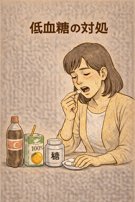低血糖の対処はブドウ糖10g、 コーラ、りんごジュース、カルピスなどの清涼飲料水(150~200mL)や砂糖(20g)を速やかに摂取し安静にするのが基本です。 対処後も症状が15分以上続くなら再度同量のブドウ糖を摂取してください。α―グルコシダーゼ阻害薬服用中で低血糖症状が現れた場合には必ずブドウ糖を摂取してください。 意識がない場合や、症状が改善しない場合には救急車を呼んでください。