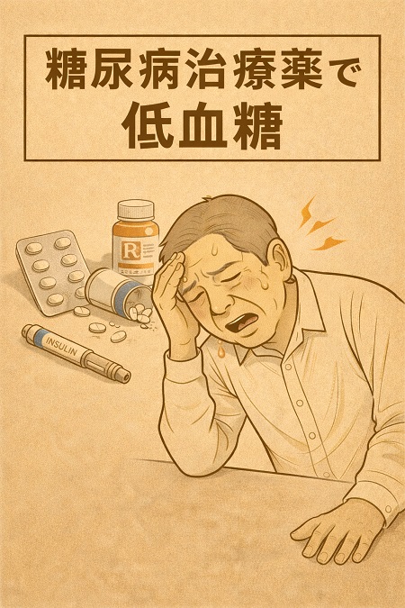糖尿病治療薬の血糖降下作用が強すぎる場合に低血糖が起こります。特にインスリン注射やSU薬(グリベンクラミド、グリメピリド)などで治療をされている方は低血糖が起こりやすく、風邪や体調不良などで食事量が少ない、食事内容が極端な糖質制限を行ったり、長時間の運動や激しい運動を行った後なども低血糖が起こります。 ※SU薬のグリベンクラミド、グリメピリドは膵臓からのインスリン分泌を促進する作用が強いので特に注意が必要
