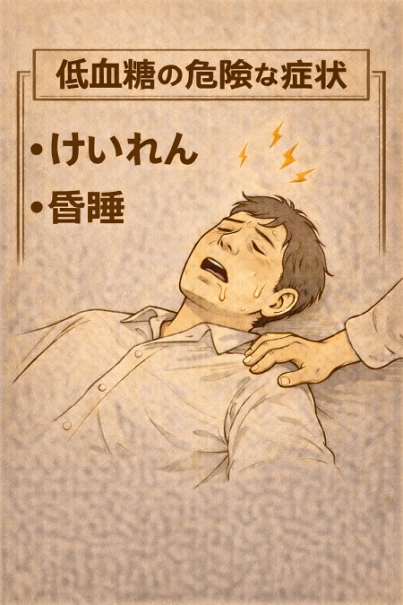 低血糖を放置すると意識障害、けいれん、昏睡に至る事もあります。重症低血糖になると回復するのに他者の援助が必要になります。