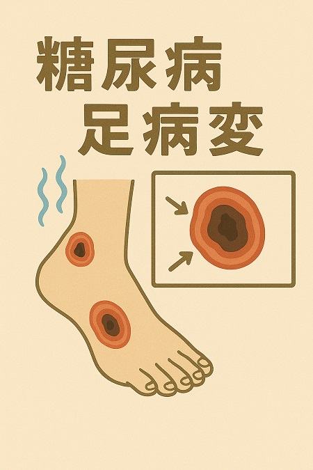 糖尿病足病変である水虫、タコ、感染症、潰瘍などが現れ、糖尿病足病変が重症化すると壊疽に至ることがあります。 また神経障害が進むと足の感覚が鈍くなり、傷や火傷に気づきにくくなるため、毎日の足の観察とフットケアが不可欠です。