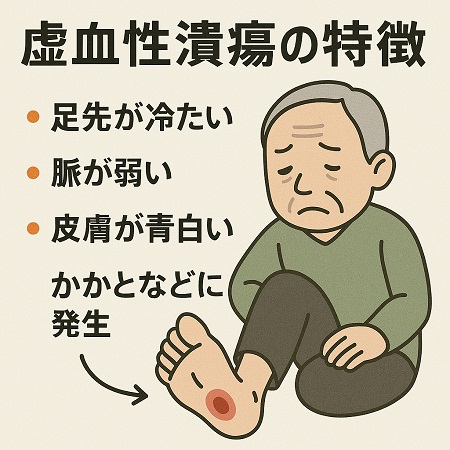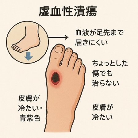 虚血性潰瘍とは糖尿病が重症化することで動脈硬化が起こり、動脈硬化が原因で足の血流が悪くなる(虚血)ことで傷が治りにくく、重症化する。虚血と感染が進行すると、組織が壊死(壊疽)する。