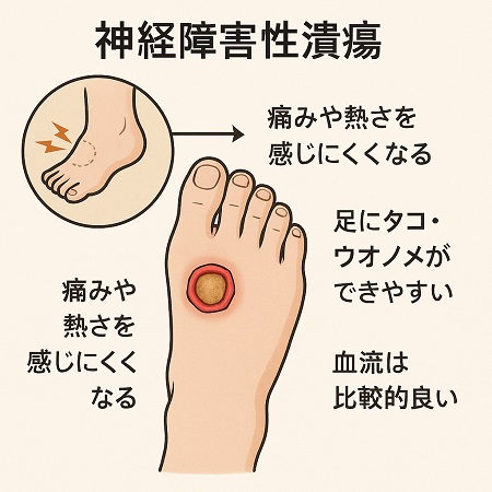 感覚神経障害:痛みや温度感覚が鈍くなることで、傷や火傷に気づかず潰瘍が出来る
