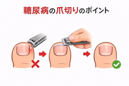 糖尿病の人の爪切りのポイントは、小さな傷が潰瘍・壊疽や感染症にならないように注意が必要です。 爪切りの基本は「深爪をしない」「まっすぐ切る(スクエアカット)」する事で、爪切りは風呂上がりの爪が柔らかい状態で行います。巻き爪、肥厚爪がある場合は、早期にフットケア外来で治療を受けてください。