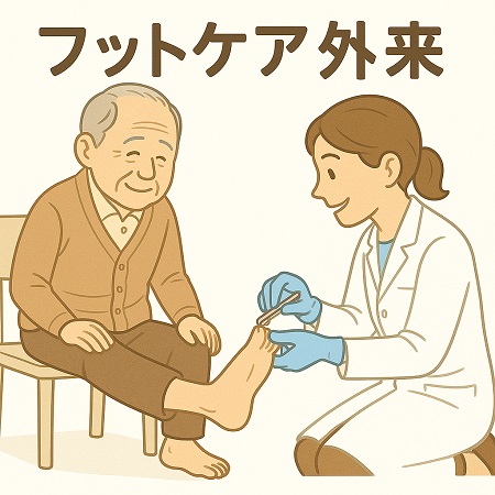 フットケア専門看護師が、足の洗浄、タコ・魚の目の処置、爪切り、保湿などを行い、セルフケア指導を通じて自宅でのフットケアで足を清潔に保ち、トラブルを未然に防げるようサポートします。