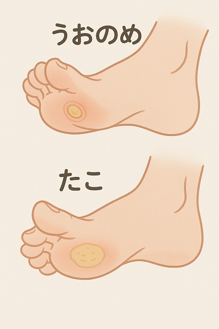鶏眼(うおのめ)、胼胝(たこ):鶏眼(うおのめ)や胼胝(たこ)の原因となる圧迫や摩擦を軽減する事が重要です。つま先に余裕のある幅広の靴を選んだり、足のアーチに合ったインソール(中敷き)を選ぶためにフットケア外来や装具士に相談してください。鶏眼(うおのめ)や胼胝(たこ)の治療としては硬い角質を削り取ったり、サリチル酸を含む軟膏や貼付剤で角質を柔らかくしたりする方法があります。