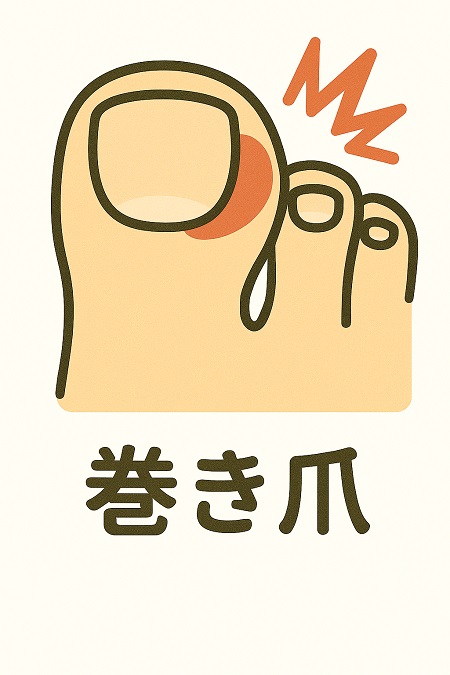 陥入爪、巻き爪:巻き爪を防ぐために重要なのは、爪の切り方です。爪を短く切りすぎてしまう「深爪」や、両端を斜めに短く切り込んだ「バイアス切り」により陥入爪(かんにゅうそう)を招くほか、爪の周りの組織によって爪の側面が押されやすくなり、巻き爪が起こります。爪の先を丸く切らず、直線にまっすぐカットするスクエアカット(四角く切る)で爪先が指先と同じくらい、もしくは少し長めになるぐらいが理想です。