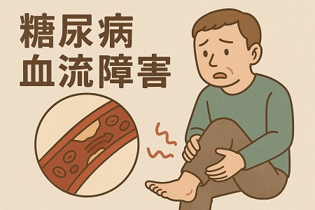 糖尿病で慢性的な高血糖によって血管が傷つき、血管の内壁が傷ついたり、糖の複合物質が蓄積して血管が厚くなったりします。 そういった血流障害によって体の各部に十分な血液が供給されなくなり、足のしびれ、冷え、痛み、傷が治りにくい、壊疽(えそ)などの合併症を引き起こし、最悪の場合、足の切断に至ることもあります。