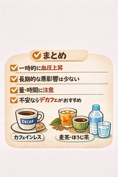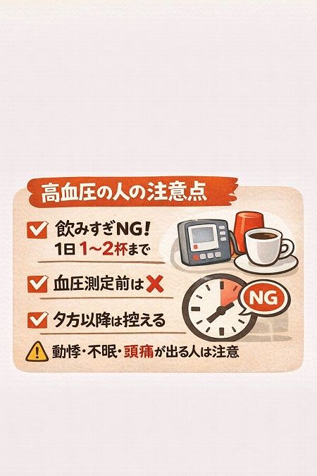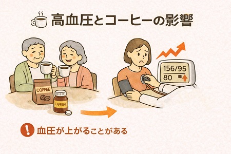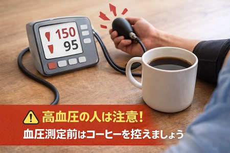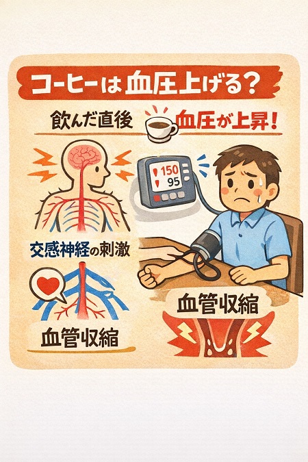 コーヒーを飲むとカフェインが神経伝達物質アデノシンの働きを妨げ、アドレナリンの分泌を促すことで血管を収縮させ心拍数を増加させるので結果として血圧が一時的に上がります。この作用は30分~2時間ほどで元に戻ります。