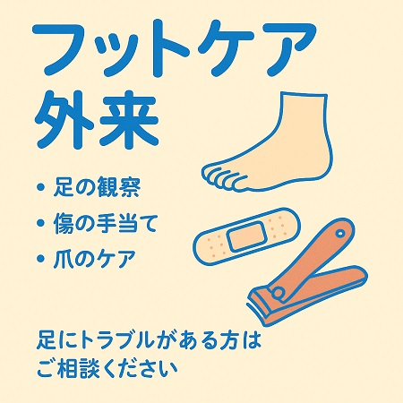 フットケア外来: 足潰瘍(かいよう)や足壊疽(えそ)などの「糖尿病足病変」の予防を目的として、糖尿病の方を対象としたフットケア外来を開設している医療機関があります。