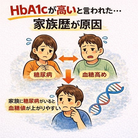 健診でHbA1cが高いと言われた方は家族歴・遺伝が原因かもしれません。 2型糖尿病は遺伝しやすい傾向があります。両親どちらかが糖尿病なら発症リスクは3〜4倍高まります。また遺伝だけでなく生活スタイル・食生活や嗜好品、運動習慣(運動不足)などの生活習慣(環境因子)も大きく影響します。