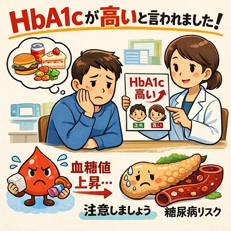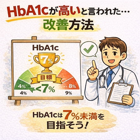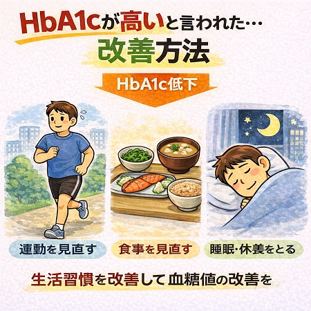 健診でHbA1cが高いと言われたといわれたら食事習慣・運動習慣の見直しましょう。具体的には血糖値スパイクを防ぐ食生活(野菜・海藻・タンパク質の摂取、炭水化物を減らす)と、食後1〜2時間のウォーキングや筋トレなどの運動習慣が効果的です。食物繊維を多く摂り、 野菜を先に食べる「ベジファースト」や食事時間を長くすること、よく噛む(一口30回程度を目安に、しっかり噛んで食べましょう)こと、一口の量を減らすことが有効です。また甘い飲み物やお菓子を過剰に摂り過ぎにも注意し、ストレスをためない事、7時間以上の睡眠を心がけましょう。