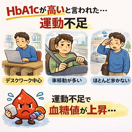 健診でHbA1cが高いと言われた原因は運動不足かもしれません。 運動不足による消費エネルギー低下と筋肉量の減少しますが、運動不足により血糖(ブドウ糖)を消費する量が減り、インスリンの働きが悪くなり、食後血糖値スパイクを招きます。 運動習慣の見直しとしては血糖値が上昇する食後1時間〜2時間後(血糖値スパイク)に10〜30分程度の「ウォーキング」や「スクワット」などの有酸素運動・筋トレが効果的です。 運動療法は食事療法と並んで重要な治療になります。筋肉を減らさず脂肪を減らし、健康的な体質改善をするとともに、カロリーを消費する事で直接的に血糖を下げることが重要です。また、運動によりインスリンの働きが良くなるといったメリットもあります。しかし、急な激しい運動は、病状によっては合併症を悪化させる場合もあるため、医師の判断による運動処方が必要です。