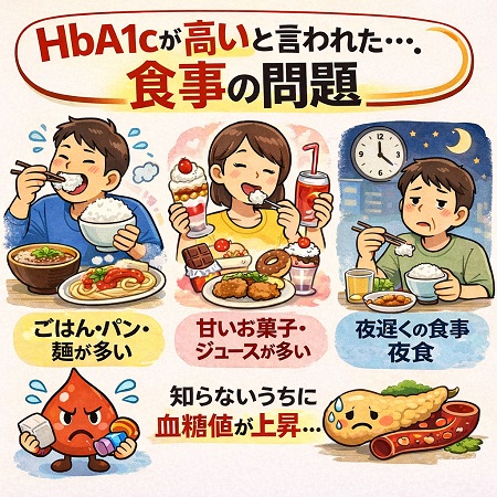 健診でHbA1cが高いと言われた原因は、ご飯の食べ過ぎやお米の食べ過ぎかもしれません。 お米など精製された炭水化物を過剰摂取すると糖尿病リスクが大幅に上昇するため、適量(1杯165g程度)に減らすか、玄米や雑穀米、胚芽米、大麦に切り替える事で食後の血糖値スパイクが緩やかになりHbA1cを下げる事が可能です。 また食べる順番を野菜・きのこ類・海藻類から始め、肉・魚などのタンパク質、最後に炭水化物の順に食べることで血糖値の急上昇を抑えることができます。 野菜を先に食べる「ベジファースト」は、野菜に含まれる食物繊維が糖質の吸収を遅らせるため、食後の血糖値の急上昇を防ぐ効果が期待できます。 ゆっくり食べることで、糖質の吸収が緩やかになり、血糖値の急激な上昇(血糖値スパイク)を抑えることができます。 またゆっくり食べることで、インスリン分泌を促進するホルモンであるGLP-1が増加し、インスリン分泌が促されます。 逆に早食いをすると、満腹感を得る前に食べすぎてしまい、血糖値が急上昇し、インスリン分泌が間に合わずに血糖値が高い状態が続くことがあります。 満腹中枢が働くまでに約15〜20分かかると言われているので、食事時間を長くすること、よく噛む(一口30回程度を目安に、しっかり噛んで食べましょう)こと、一口の量を減らすこと、食物繊維の多い食品を選ぶことなどが有効です。 お米以外に血糖値を急上昇させる食べ物には、甘い飲み物やお菓子があり、甘い飲み物やお菓子を過剰に摂り過ぎると血液中のブドウ糖の量が余り血糖値の上昇を引き起こします。