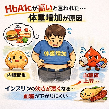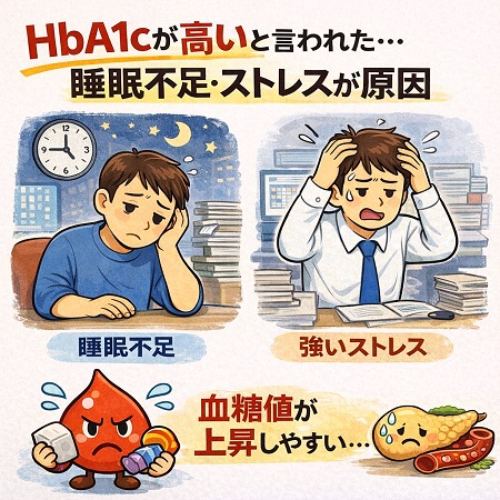 健診でHbA1cが高いと言われた原因は睡眠不足とストレスかもしれません。睡眠不足やストレスはコルチゾールやアドレナリンなどのホルモン分泌を促し、インスリン抵抗性(インスリンに効きが悪くなる)を高めるため、慢性的な高血糖状態が続きHbA1cが上がります。糖尿病を悪化させない為には1日7〜8時間の睡眠が理想です。6.5時間未満の短い睡眠は、糖尿病の発症リスクを約30%〜50%上昇させるとの報告がされています。
