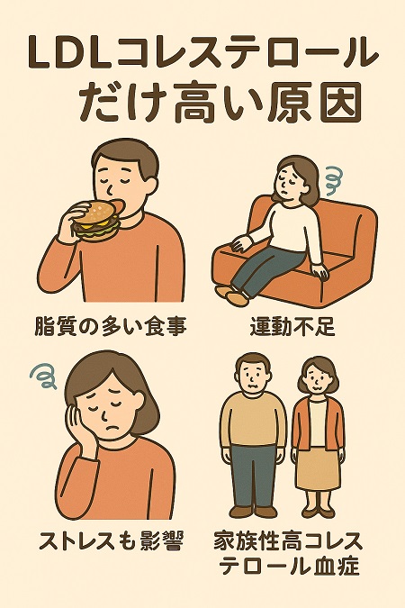 LDL コレステロールだけ高い原因として、飽和脂肪酸やトランス脂肪酸の多い食品の摂りすぎ、カロリーの過剰摂取、食物繊維の不足などの食生活が考えられます。