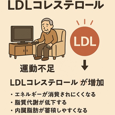 LDL コレステロールだけ高い原因として運動不足が考えられます。 運動不足が続くとエネルギー消費量が低下し肥満症を引き起こし、結果としてLDL コレステロールの上昇に繋がります。 特に内臓脂肪型肥満は中性脂肪が増加し、コレステロールの運搬と回収のバランスが崩れて、LDLコレステロールが過剰になり、善玉コレステロール(HDL)を低くします。。 LDL コレステロールと運動不足、肥満は密接な関係にあります。
