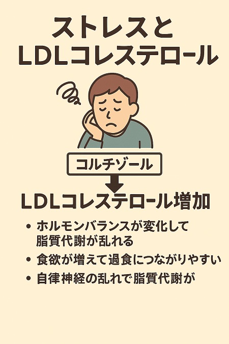 LDL コレステロールだけ高い原因としてストレスによってコルチゾールなどのホルモンの分泌が増加し、LDLコレステロールを増やすためです。