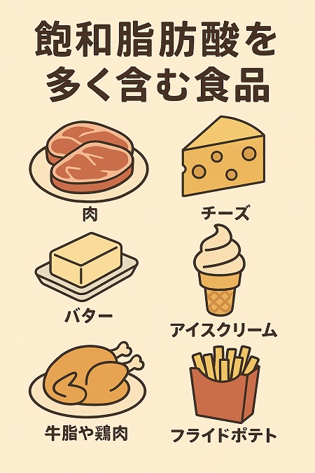 飽和脂肪酸を多く含む食べ物:動物性油脂(ラード、バター、牛脂)、植物性油脂(パーム油、ココナッツ油)、肉の脂身、乳製品(生クリームやチーズ)、菓子類(バター、ショートニングを使ったもの)、ファストフード。