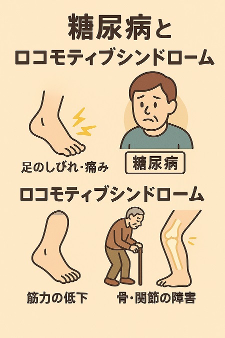 糖尿病になるとインスリンの作用が不十分になり、筋肉細胞の増殖・成長が妨げられ、筋肉量の減少や筋力低下が起こりやすく、運動器が衰えロコモティブシンドロームになります。また筋肉量が減ると、血糖コントロールがうまくいかなくなり、糖尿病を悪化させる可能性もあります。