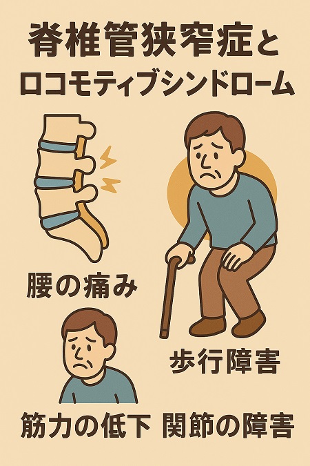 脊柱管狭窄症とは加齢で背骨の関節がすり減ったり、靭帯が厚くなったり、椎間板が膨らんだりすることで、脊柱管が狭くなり脊髄や神経が圧迫されることで、腰痛や坐骨神経痛、足のしびれなどの症状がでる病気です。 腰痛や坐骨神経痛で歩くのが困難になったり(間欠性跛行)、階段を登れなくなることで筋力や活動量が減り、立つ、座る、歩くといった移動機能の低下からロコモティブシンドロームになります。