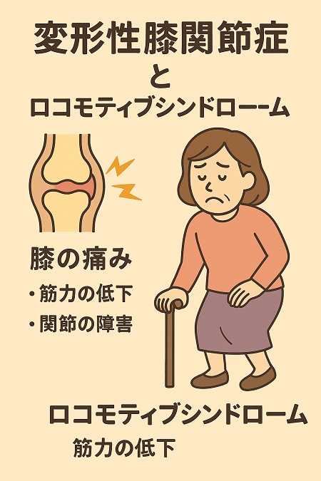 変形性膝関節症は加齢などにより膝の軟骨が弾力を失い、すり減ることで骨が変形して痛みで動きにくくなる病気です。 膝が痛みから歩くのが困難になったり、階段を登れなくなることで筋力や活動量が減りロコモティブシンドロームになります。