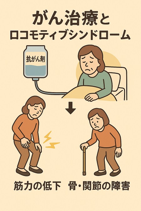 がんが進行すると筋肉量の減少(悪液質)し、疲れやすくなったり活動量が減ります。 入院治療のために安静期間が長くなり、筋力が低下することで筋力や活動量が減りロコモティブシンドロームになります。