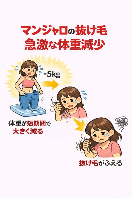 マンジャロ副作用の抜け毛(禿げる)は急激な体重減少や体脂肪率の低下、ホルモンバランスの乱れによる「休止期脱毛症」ですので、 抜け毛対策としては急激なダイエットやストレスをかけない事が重要です。吐き気や、食欲低下が続く場合は早めに医療機関へ相談してください。