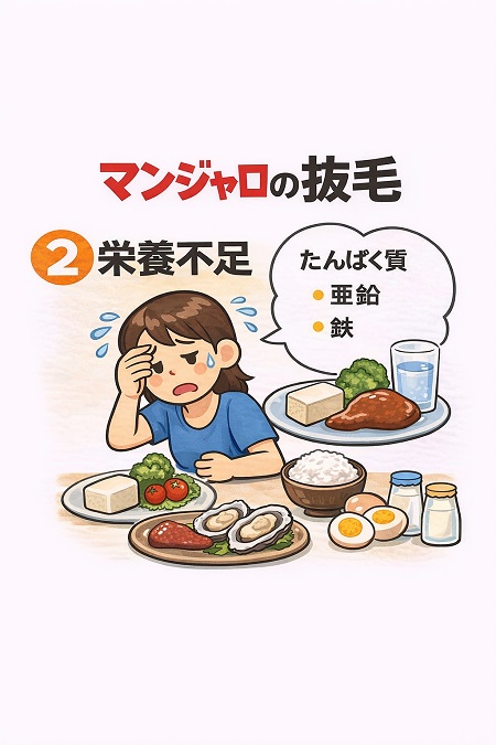 マンジャロ副作用の抜け毛は栄養不足が原因で起こります。 マンジャロの食欲抑制効果で摂取カロリーが減少し、栄養不足になるリスクがあります。特に鉄、亜鉛、ビタミンD、タンパク質が不足しやすく、 栄養不足により髪の成長期を短縮し、頭皮全体が薄くなる「休止期脱毛症」を引き起こします。