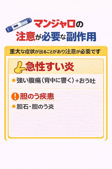 マンジャロの副作用で注意が必要な副作用は背中まで響くような激しい腹痛、吐き気の症状が現れる急性膵炎や、発熱、右上腹部の痛み、皮膚や目が黄色くなる胆嚢炎・胆管炎、 ろれつが回らなくなる、ふらつく、冷や汗、強い空腹感、吐き気、動悸などの症状が出る低血糖です。