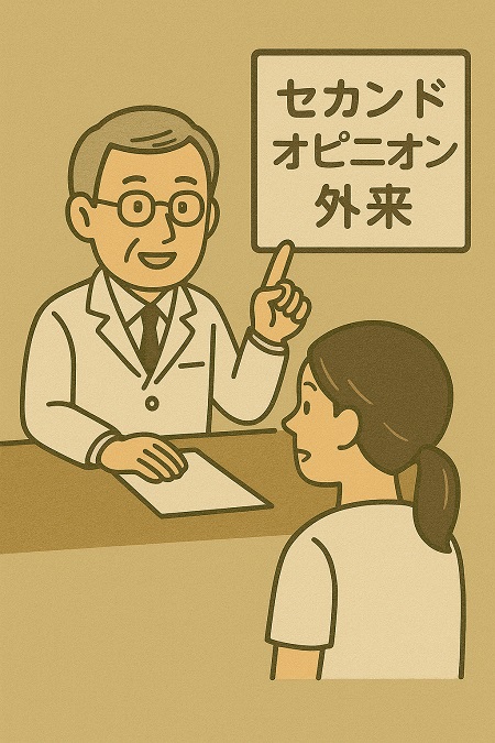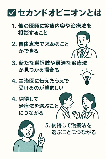 セカンドオピニオンとは主治医とは別の医師に、患者さんが納得のいく治療選択ができるように、治療の進行状況、現在行われている治療以外の選択肢や、治療方針について「第2の意見」を求めることです。