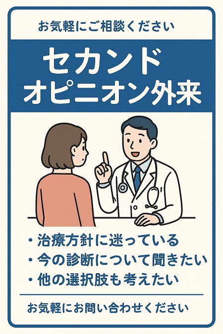 セカンドオピニオン外来:セカンドオピニオン外来とは、別の医療機関で治療を受けている方が、診療内容や治療法に関して専門医の意見・判断を聞くことにより、患者さんが納得のいく治療法を選択できるよう参考情報を提供することであり、新たな検査や治療は行わないことが原則です。