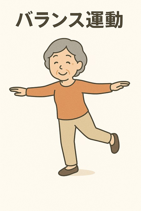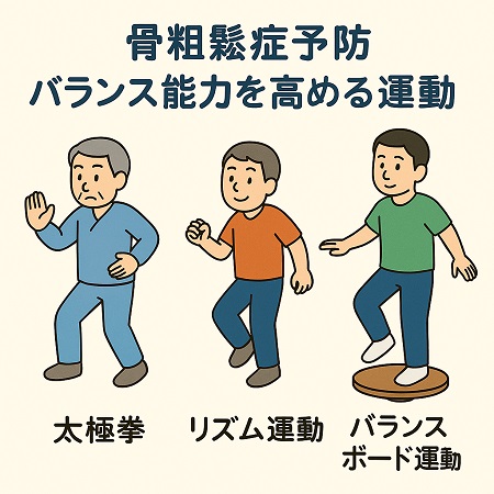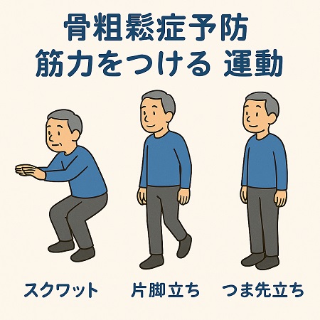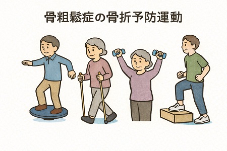 骨粗鬆症 骨折の予防にはバランス運動が有効です。バランス運動は転倒予防と骨への適度な刺激が目的で、「片足立ち(フラミンゴ療法)」や「スクワット」、「かかと上げ」などが効果的です。