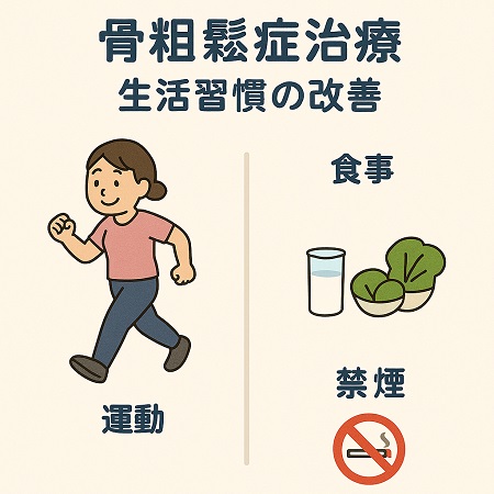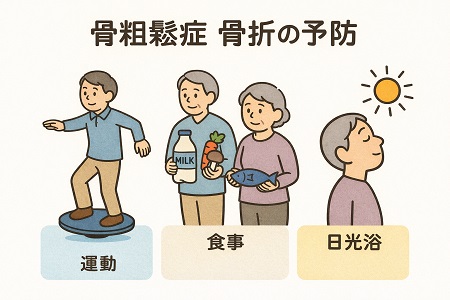 骨粗鬆症 骨折の予防には、、カルシウム、ビタミンD(鮭、きのこ類)、ビタミンK(納豆)を意識したバランスの良い食事と、ウォーキングや筋トレ(スクワット、片足立ち、)やかかと落としなど骨に刺激を与える運動、ビタミンD生成の為の日光浴、禁煙・節酒・カフェイン制限などの生活習慣改善と、骨密度を定期的に測定して個々の状態に合わせた薬物療法が重要です。