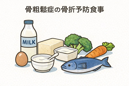 ■骨粗鬆症 骨折予防食事療法では、骨の主成分であるカルシウムを積極的に摂取するとともに、カルシウムの吸収を助けるビタミンDの摂取も重要です。また骨の形成や構成を良くするためにビタミンK、タンパク質も摂取してください。