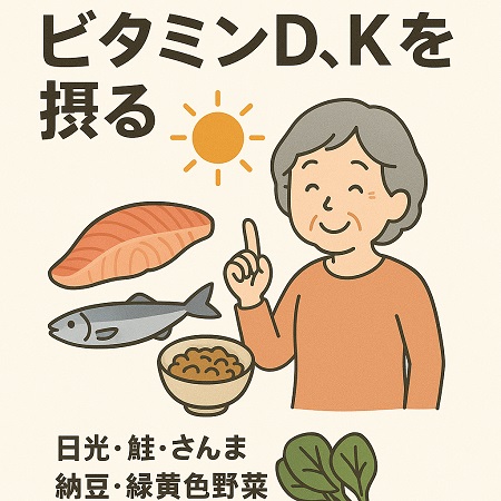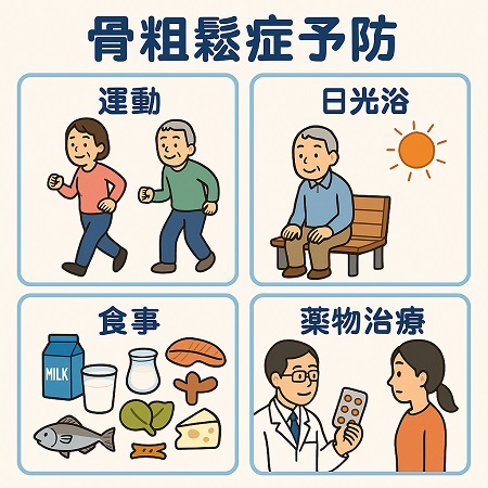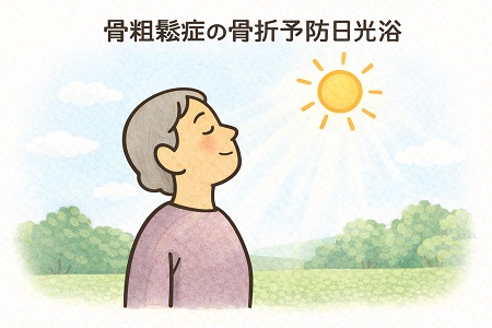 骨粗鬆症予防に適度な日光浴が有効です。日光浴によりカルシウム吸収やビタミンDが体内で生成されます。日光浴は夏場は木陰で30分程度、冬場は日向で30分~1時間程度が目安で行ってください