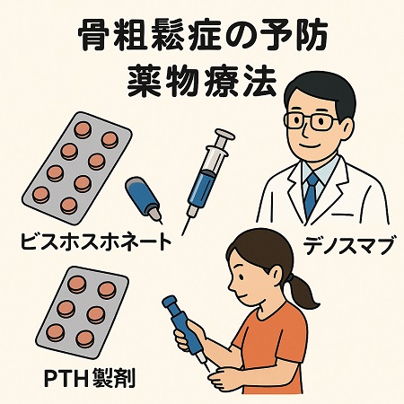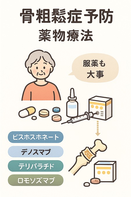 ■骨の吸収を抑える薬:ビスホスホネート製剤(フォサマック錠、ボナロン錠、ボンビバ錠など)、抗RANKL抗体製剤(プラリア皮下注60mg、ランマーク皮下注120mg)などが用いられます。ビスホスホネート製剤(フォサマック錠、ボナロン錠、ボンビバ錠など)や抗RANKL抗体製剤(プラリア皮下注60mg、ランマーク皮下注120mg)は、骨を溶かす細胞(破骨細胞)の働きを弱め、骨密度を増加させるます。