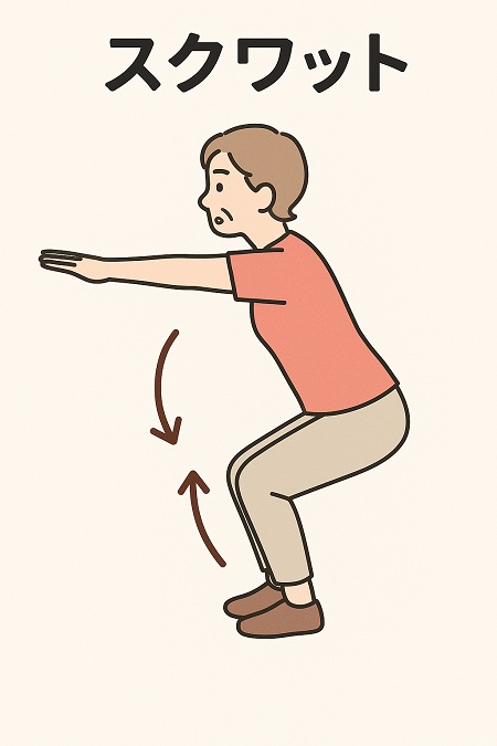 スクワット運動は椅子を使った「立ち座り運動」や、10秒かけてゆっくりとゆっくりしゃがむ「スロースクワット」などでも効果があります。