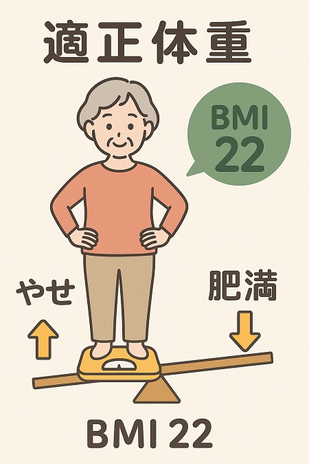 骨粗鬆症 骨折の予防には適正な体重維持が重要です。 骨粗鬆症 骨折の予防には、痩せすぎも太り過ぎても骨折のリスクが上がります。骨粗鬆症 骨折の予防の目標としたいてBMIは 18.5~24.9程度(特に高齢者は21.5以上)です。低体重は転倒や骨折リスクを高め、肥満は生活習慣病や続発性骨粗鬆症のリスクを高めるます。バランスの取れた食事(カルシウム、ビタミンD、Kなど)と適度な運動で骨に刺激を与えつつ、筋肉量を維持することが骨の健康(骨量・骨質)の維持・改善につながります。