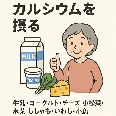 牛乳、乳製品(ヨーグルト)、小魚(しらす、煮干し)、大豆製品(豆腐、納豆)、海藻類(ひじき、わかめ)、緑黄色野菜(小松菜、チンゲン菜)