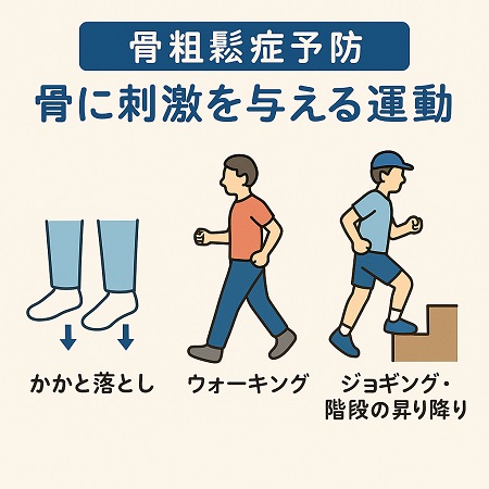 骨粗鬆症 骨折の予防に良い運動は、運動することで骨に刺激を与え(負荷運動)、骨密度を高める1日8000歩程度のウォーキング、パワーウォーキング(ダンベルを持ったり、バンドとして巻く)や階段の上り下り、ジョギング、ジャンプ運動やダンス、スクワット、水泳などの筋力トレーニングです。また転倒予防(骨折予防)として片足立ちなどのバランス運動も重要です。