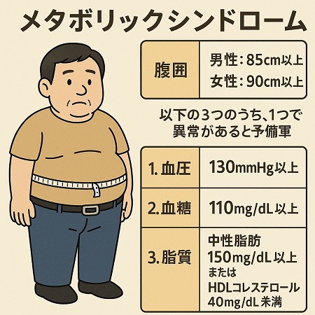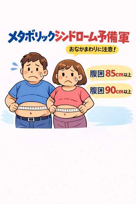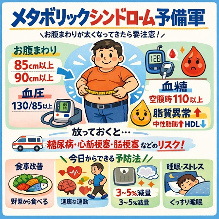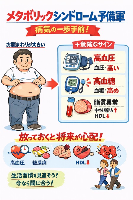 メタボリックシンドローム予備軍とは、腹囲(男性85cm/女性90cm以上)があり、かつ血圧・血糖・脂質のうち1項目で基準値を超えている状態で、この段階で生活習慣(食事・運動・睡眠)の改善を行えば、動脈硬化や心筋梗塞・脳卒中などの発症を防ぎ健康な状態に戻れる可能性が高いので健康診断で指摘されたら放置せず、まずはかかりつけ医にご相談ください。