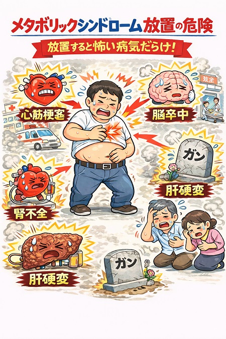 メタボリックシンドロームを放置する主な危険性は、内臓脂肪によって引き起こされる高血圧、高血糖、脂質異常症などが重なることで動脈硬化が急速に進行し、結果として心筋梗塞や脳卒中などの重篤な心血管疾患のリスクが大幅に高まることです。さらに、糖尿病、高尿酸血症、腎臓病、認知症、脂肪肝、睡眠時無呼吸症候群など、他の様々な生活習慣病を引き起こす可能性もあります。