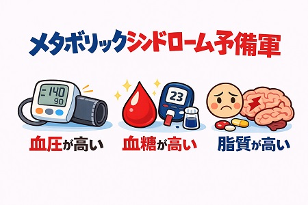 メタボリックシンドローム予備軍は内臓脂肪型肥満をベースに、高血圧・糖尿病(高血糖)・脂質異常症(LDLコレステロール高い)といった生活習慣病の危険因子が複数重なり、動脈硬化が進行し心心筋梗塞や脳卒中、腎不全などの重大な病気に至る「一歩手前」の危険な状態です。