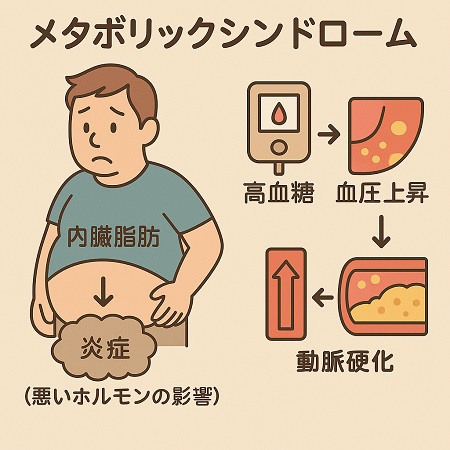 メタボリックシンドロームは、内臓脂肪の蓄積を原因とし、以下の3つの危険因子を複数持つ状態を指します。