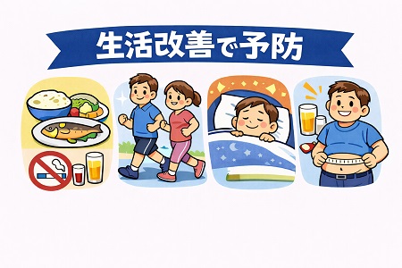 高血圧 : 減塩(1日の目標塩分摂取量は6g未満)を中心とした食事療法(野菜をしっかり食べる、カリウム、カルシウムを取る)、アルコール制限を行う(25g/日以下)。