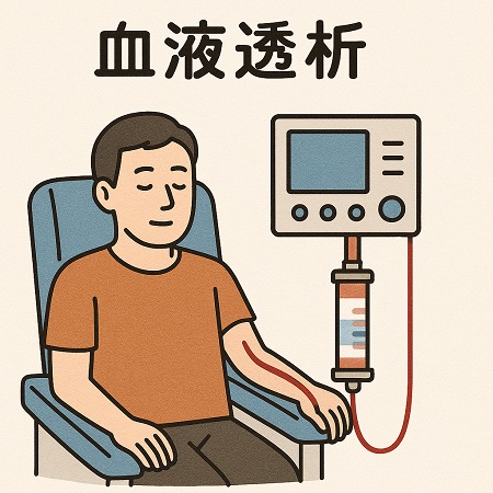 血液透析(HD):血液を体外に取り出し、透析装置で老廃物や余分な水分を取り除いた後、体内に戻す治療です。